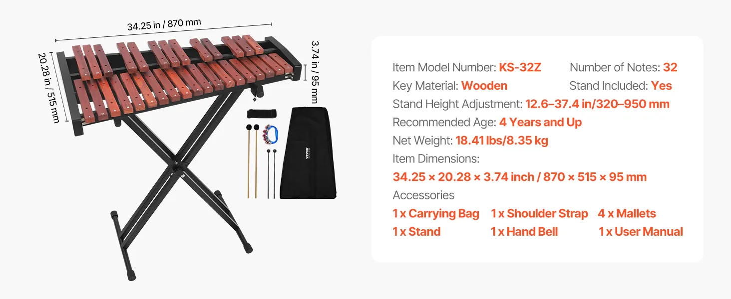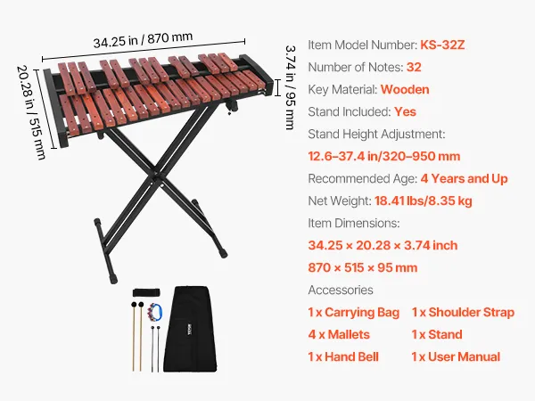 VEVOR Glockenspiel, 32 Noten, professionelles Xylophon-Schlaginstrument aus Holz, mit höhenverstellbarem Ständer aus Kohlenstoffstahl, 4 Schlägeln, Tragetasche, Musikinstrumenten-Set für Anfänger