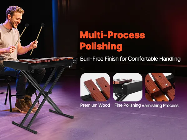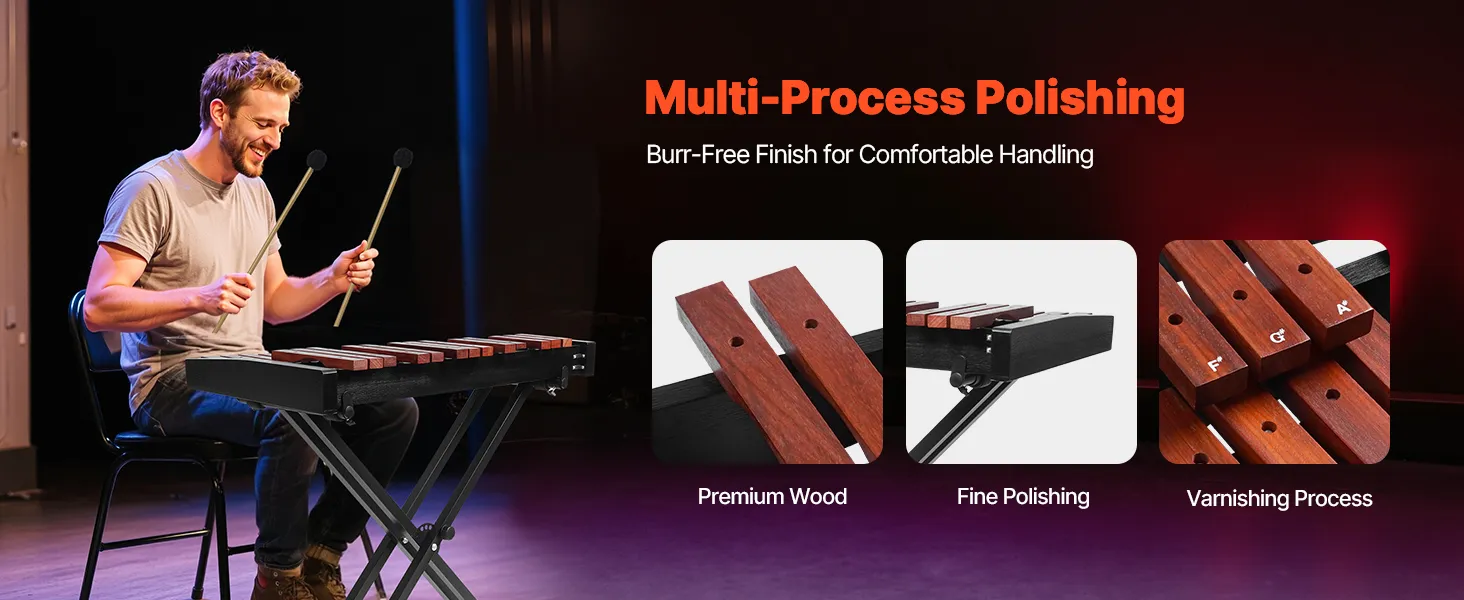 Exquisite Verarbeitung: Der hölzerne Glockenspiel-Xylophonrahmen wird in mehreren Schleifschritten poliert und anschließend mit Klarlack für eine glatte, gratfreie Oberfläche versehen. Es ist nicht nur sicher in der Anwendung, sondern auch optisch ansprechend und von sichtbarer Qualität.