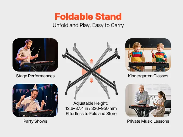 Faltbarer X-Ständer: Dieses Holzxylophon wird mit einem faltbaren X-Ständer aus Kohlenstoffstahl geliefert, der beim Spielen absolut stabil bleibt. Die einstellbare Höhe von 32–95 cm ist für alle Altersgruppen geeignet, und das faltbare Design ermöglicht mühelose Lagerung und Transport.