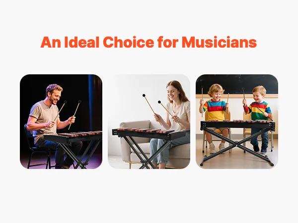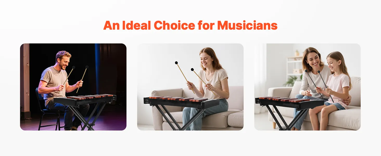 Unser Xylophon-Schlaginstrument verfügt über einen faltbaren X-Ständer aus Karbonstahl – langlebig, stabil und wackelfrei beim Spielen. Die Höhe ist flexibel einstellbar und passt sich so Spielern jeden Alters an. Lässt sich kompakt zusammenfalten und in der Tragetasche verstauen – für unterwegs oder unterwegs.