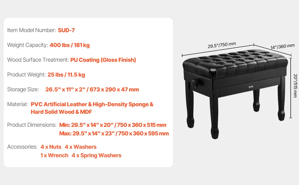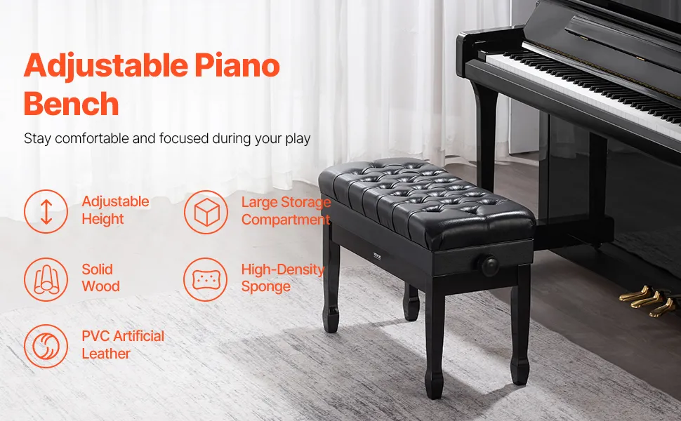 VEVOR Klavierbank, 750x360x515 mm, Duett-Keyboard-Klavierstuhl, 51 bis 59 cm einstellbare Höhe, gepolstertes Kissen, Ablagefach für Notenbücher, Pianobank aus Holz, für Schminktisch, Schlafzimmer