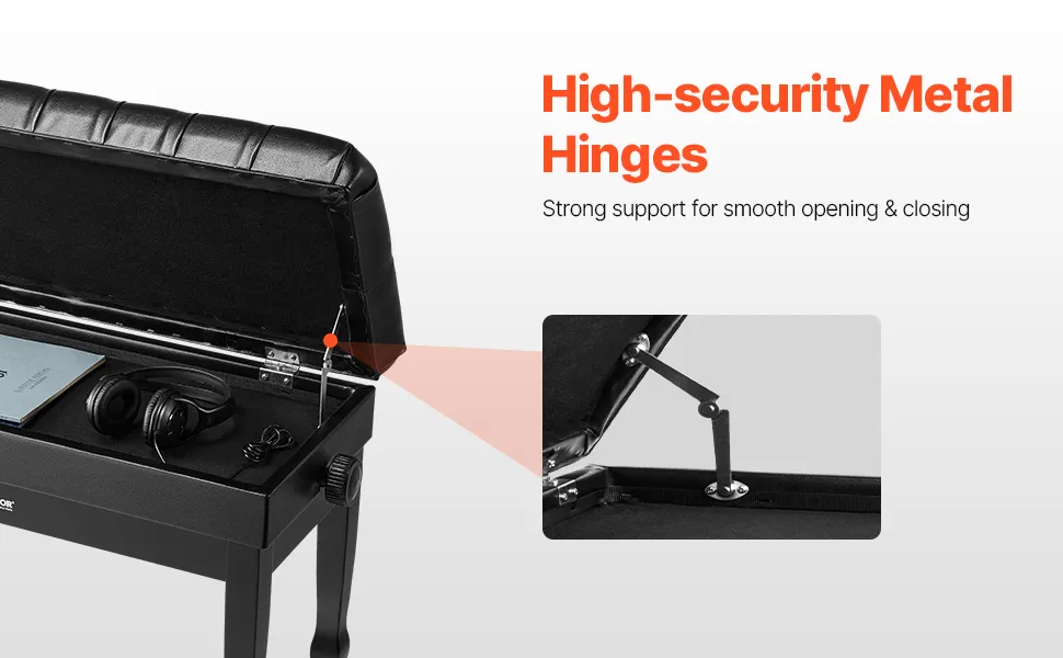 Dieser Klavierhocker ist mit hochwertigen Metallscharnieren ausgestattet und bietet stabilen Halt und eine reibungslose Bedienung beim Öffnen und Schließen. Diese langlebigen Scharniere ermöglichen einen einfachen Zugriff auf das Ablagefach und minimieren gleichzeitig Geräusche und Reibung.