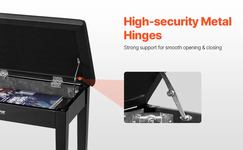Dieser Klavierhocker ist mit hochwertigen Metallscharnieren ausgestattet. Diese langlebigen Scharniere ermöglichen einen einfachen Zugriff auf das Ablagefach und minimieren gleichzeitig Geräusche und Reibung, was Ihr Spielerlebnis verbessert.