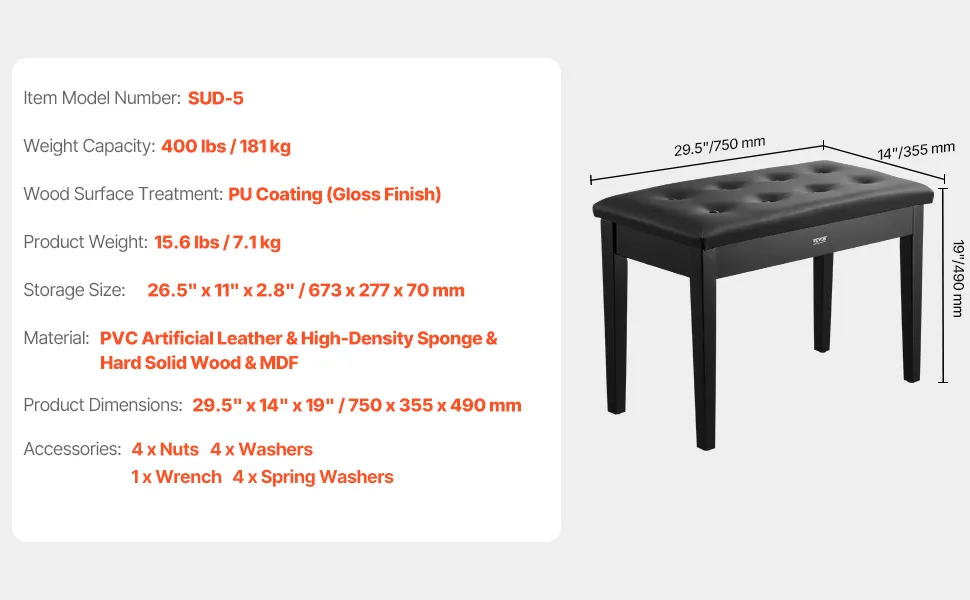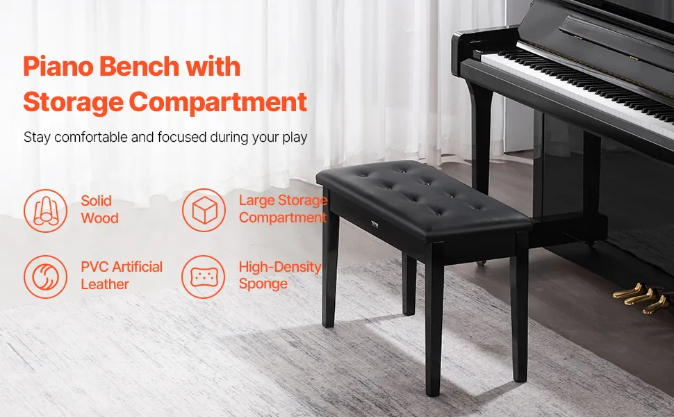 VEVOR Klavierhocker 750 x 355 x 490 mm, Klavierbank, Klavierstuhl mit hochdichter Polsterung, Ablagefach für Notenbücher, hölzerner Pianobank, Hockersitz, für Schminktisch und Wohnzimmer