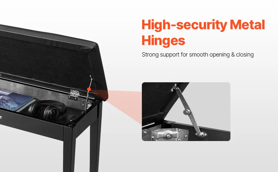 Dieser Klavierhocker ist mit hochwertigen Metallscharnieren ausgestattet und bietet stabilen Halt und eine reibungslose Bedienung beim Öffnen und Schließen. Diese langlebigen Scharniere ermöglichen einen einfachen Zugriff auf das Ablagefach und minimieren gleichzeitig Geräusche und Reibung.