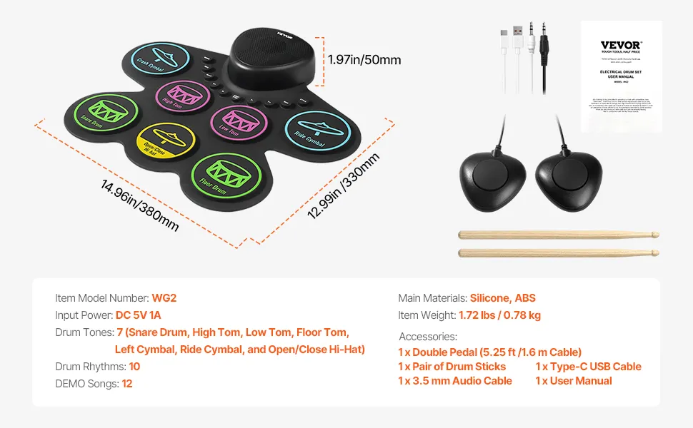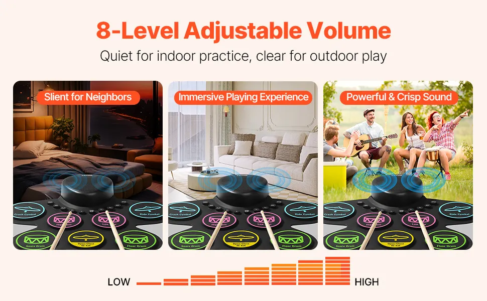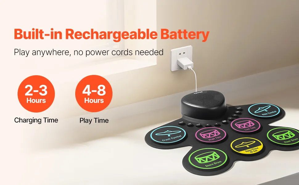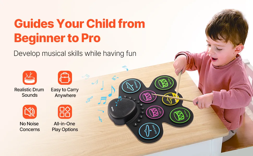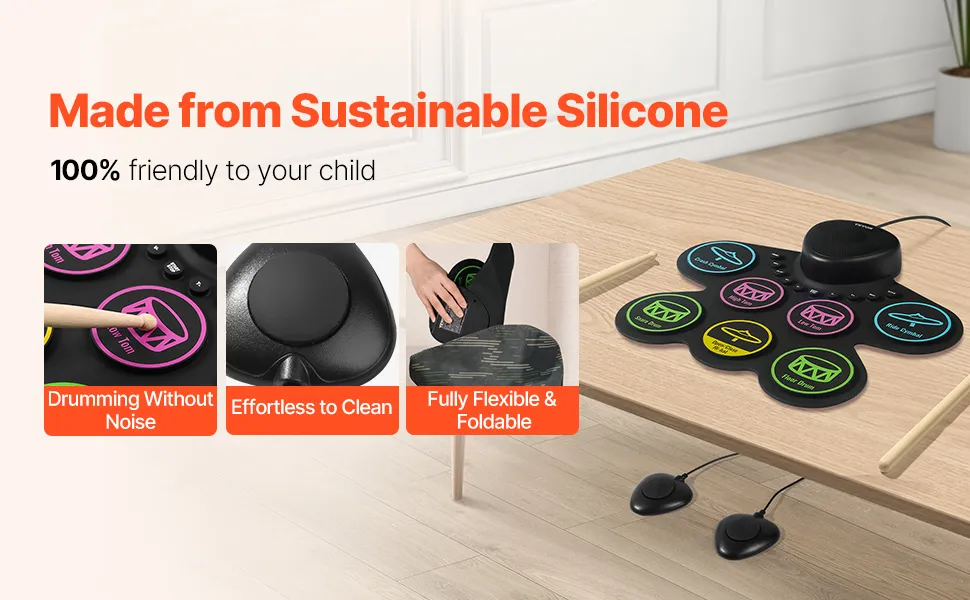Tragbar und leicht zu tragen: Die Drum-Pads unseres elektronischen Schlagzeugs für Kinder bestehen aus nachhaltigem Silikon, sind leicht und faltbar. Mit einem eingebauten 1000-mAh-Akku ist es zum Spielen in jeder Umgebung geeignet, egal ob zu Hause oder im Freien.