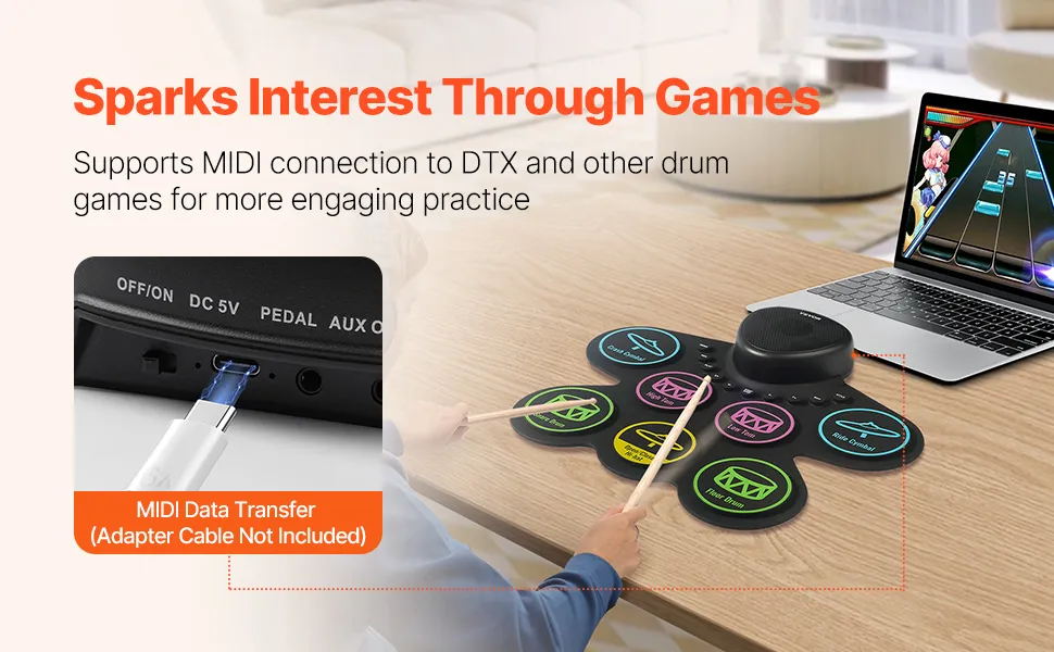 Dank MIDI-Unterstützung lässt sich unser elektrisches Schlagzeug für Kinder problemlos an einen Computer oder andere Geräte anschließen. So können Kinder verschiedene Musiksoftware für interaktives Lernen nutzen, was das Üben spannender und spannender macht.