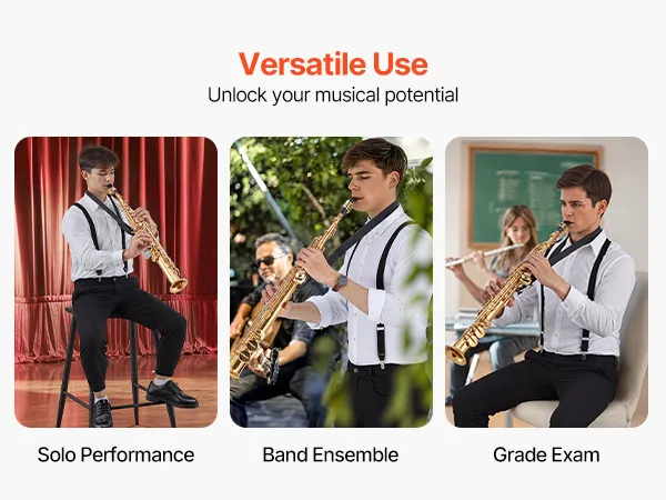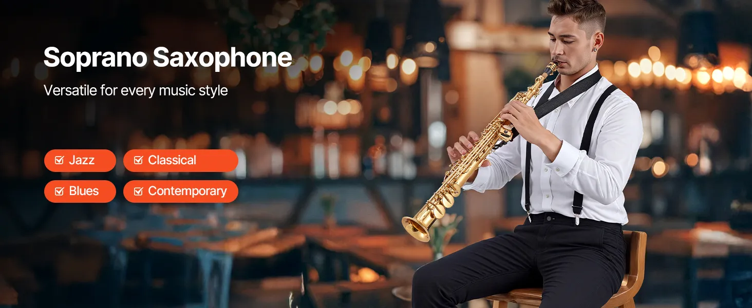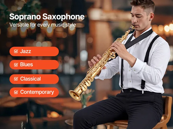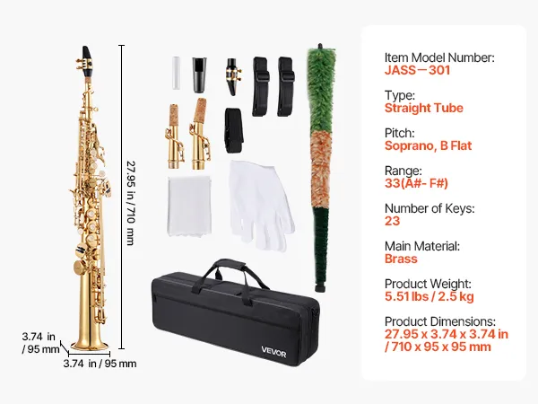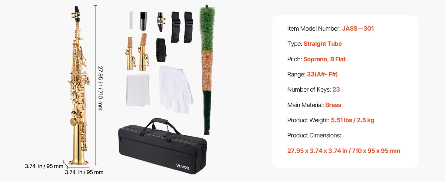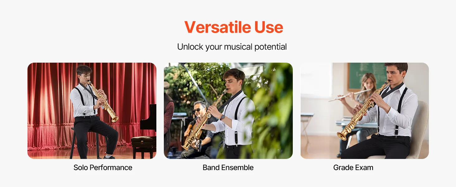 B-Sopransaxophon: Dieses Saxophon-Anfängerset verfügt über einen Tonumfang von 33 Tönen (A# - F#) und 23 Tasten und bietet einen kraftvollen Ton und einen hohen Klang für Soli, rhythmisches Spiel und Improvisation