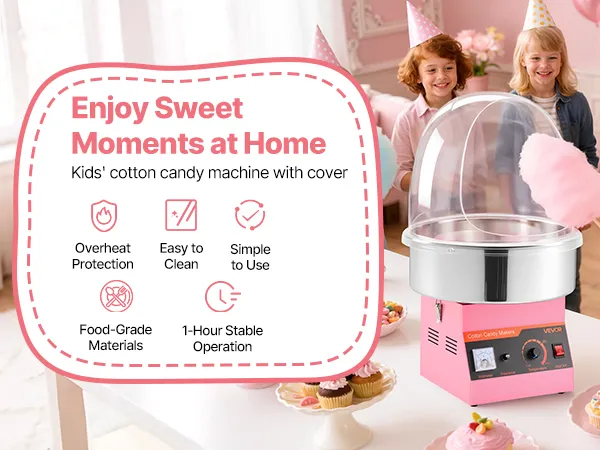 Unsere Zuckerwattemaschine mit Kuppel ist ideal für jeden Anlass. Ob Geburtstagsparty, Weihnachtsfeier, Gartenfest oder Süßwarenladen – sie sorgt überall für fröhliche Stimmung. Schaffen Sie süße Erinnerungen und machen Sie jedes Event zu einem unvergesslichen Erlebnis.