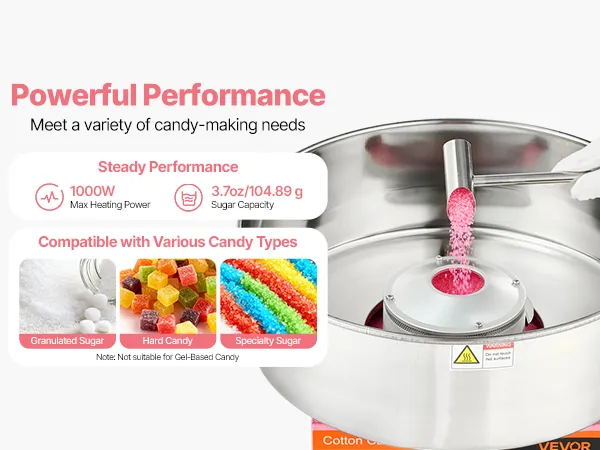 Verbesserte Leistung: Erleben Sie die starke Leistung unseres Zuckerwattegeräts für Kinder mit 1000 W Heizleistung und einem 3,7 Unzen (104,89 g) fassenden Zuckerbehälter. Es erreicht bis zu 3.500 U/min und ermöglicht einen gleichmäßigen Betrieb von bis zu einer Stunde. Es eignet sich für Kristall-, Hart- und Milchzucker (Gel nicht enthalten)