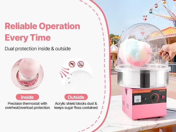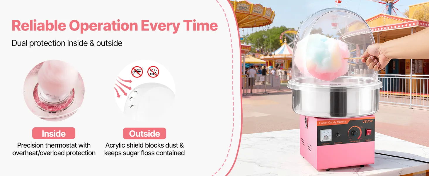 Unser Zuckerwattegerät verfügt über einen intelligenten Überlastungsschutz, der Störungen reduziert und die Lebensdauer verlängert. Der Acryldeckel hält herumfliegende Zuckerpartikel zurück und schützt vor Staub und Schmutz – für ein saubereres und angenehmeres Zuckerwatte.
