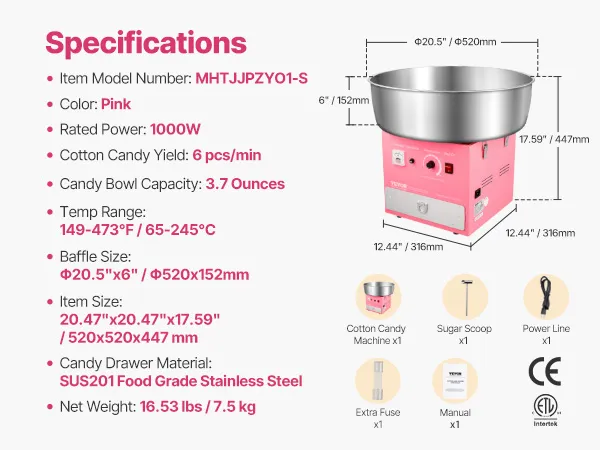Diese Zuckerwattemaschine verfügt über einen 1000-Watt-Motor und eine große Zuckerwatteschale, die maximal 6 Zuckerwatten pro Minute produziert. Mit dieser Maschine wird die Herstellung von Zuckerwatte effizienter und müheloser.