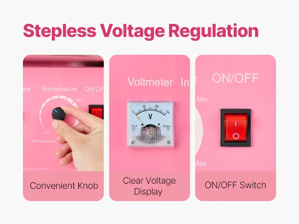 Temperaturregelung: Im Gegensatz zu den herkömmlichen Geräten verfügt unser elektrischer Zuckerwattebereiter über einen Spannungsmesser und einen Spannungsregelungsknopf. Wenn Sie die Spannung ändern, können Sie einfach die Temperatur einstellen. Wenn Sie verschiedene Zuckergeschmacksrichtungen ausprobieren möchten, brauchen Sie unbedingt diesen