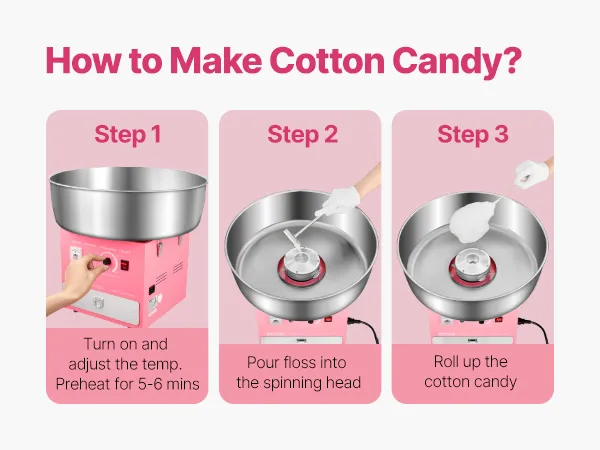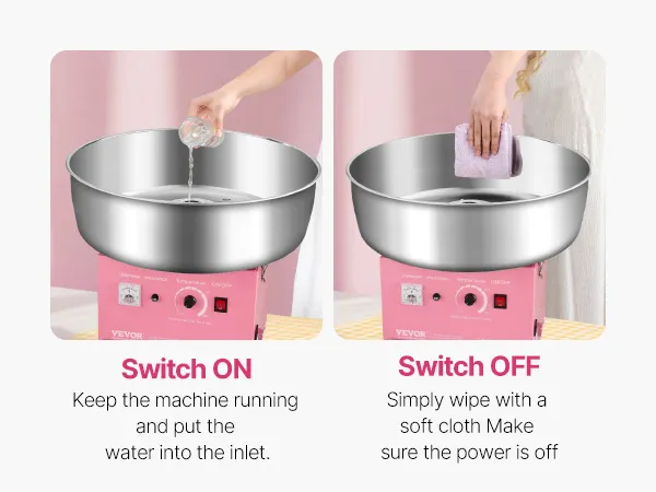Einfache Bedienung: Die Bedienung dieser Maschine ist kinderleicht. Schalten Sie den Strom ein, stellen Sie die Spannung ein, lassen Sie die Maschine 2-3 Minuten aufwärmen und gießen Sie Zucker in den Spinnkopf. Anschließend müssen Sie nur noch die Zuckerwattestäbchen verwenden, um die Zuckerwatte vom Kopf zu nehmen. Selbst beim ersten Mal gelingt die Herstellung perfekter Zuckerwatte ganz einfach
