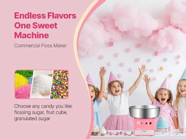 Mit jeder beliebigen Süßigkeit arbeiten: Mit dieser Zuckerwattemaschine können Sie mit herkömmlichem Zuckerwatte, Milchzucker, Fruchtwürfeln oder Ihren Lieblingsbonbons köstliche Zuckerwatte herstellen. Dank ihrer kompakten Größe eignet sie sich für den Einsatz auf der Arbeitsplatte und ist perfekt für Karneval, Festivals, Geburtstagsfeiern und Sportveranstaltungen