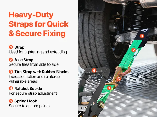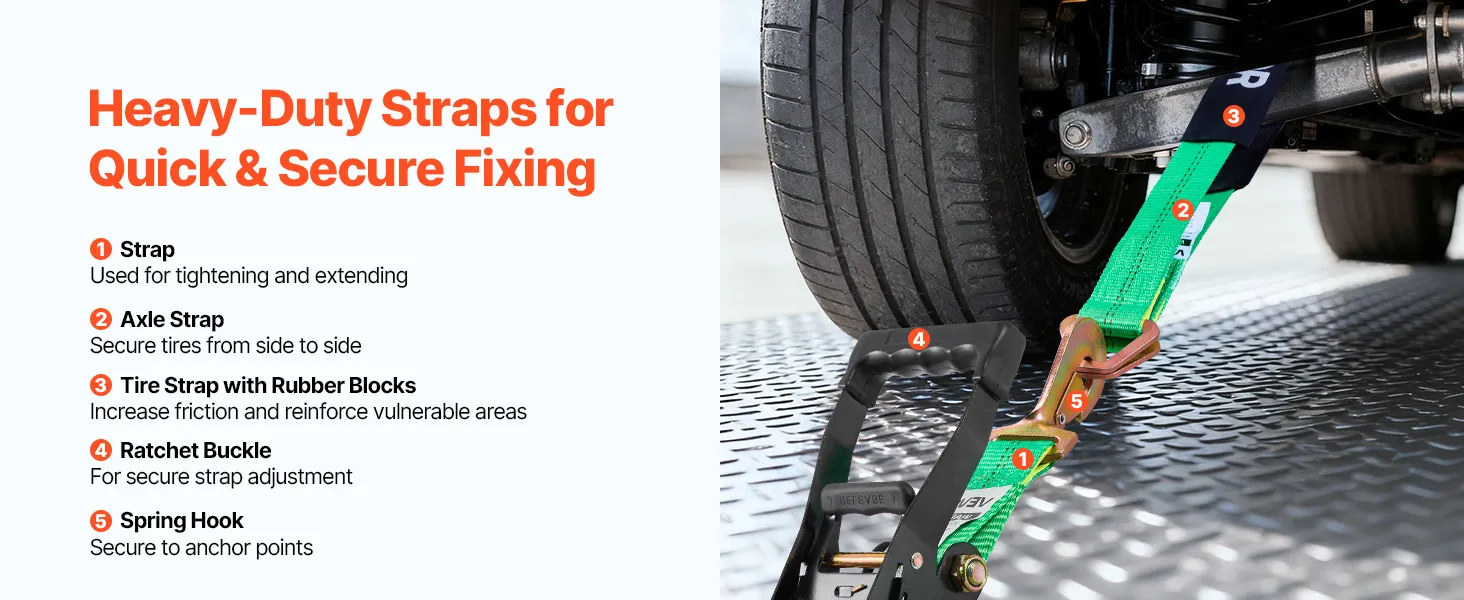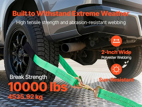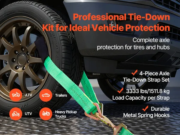 Schadensresistente Sicherung: Das achsenorientierte Design verhindert Schäden an Reifen und Rädern. Unser Reifengurt-Set enthält 96 Zoll (2438,4 mm) lange Federhaken-Ratschengurte und jeweils vier Sätze 36 Zoll (914,4 mm) und 24 Zoll (609,6 mm) lange Achsgurte und bietet so sicheren und effizienten Transport für LKWs, SUVs oder Oldtimer