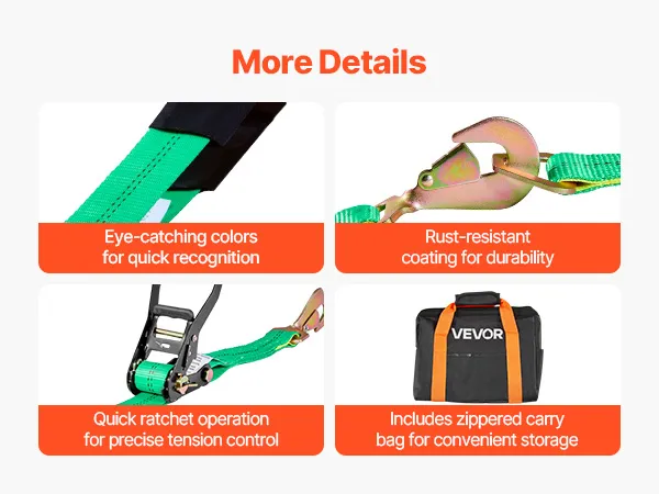 Hohe Tragfähigkeit: Dank des hochfesten Gurtbands löst oder bricht das Befestigungsgurt-Set nicht so leicht. Es kann bis zu 3333 lbs (1512 kg) tragen und hat eine Bruchfestigkeit von 10009 lbs (4540 kg). Dies bietet Zuverlässigkeit für den Transport schwerer Fahrzeuge.