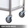Vier Lenkräder am Boden des Wagens für reibungslose Bewegungen. Sie können problemlos schwere Lasten tragen und sparen Zeit und Mühe. Zwei Räder sind feststellbar, um den Wagen an Ort und Stelle zu sichern.