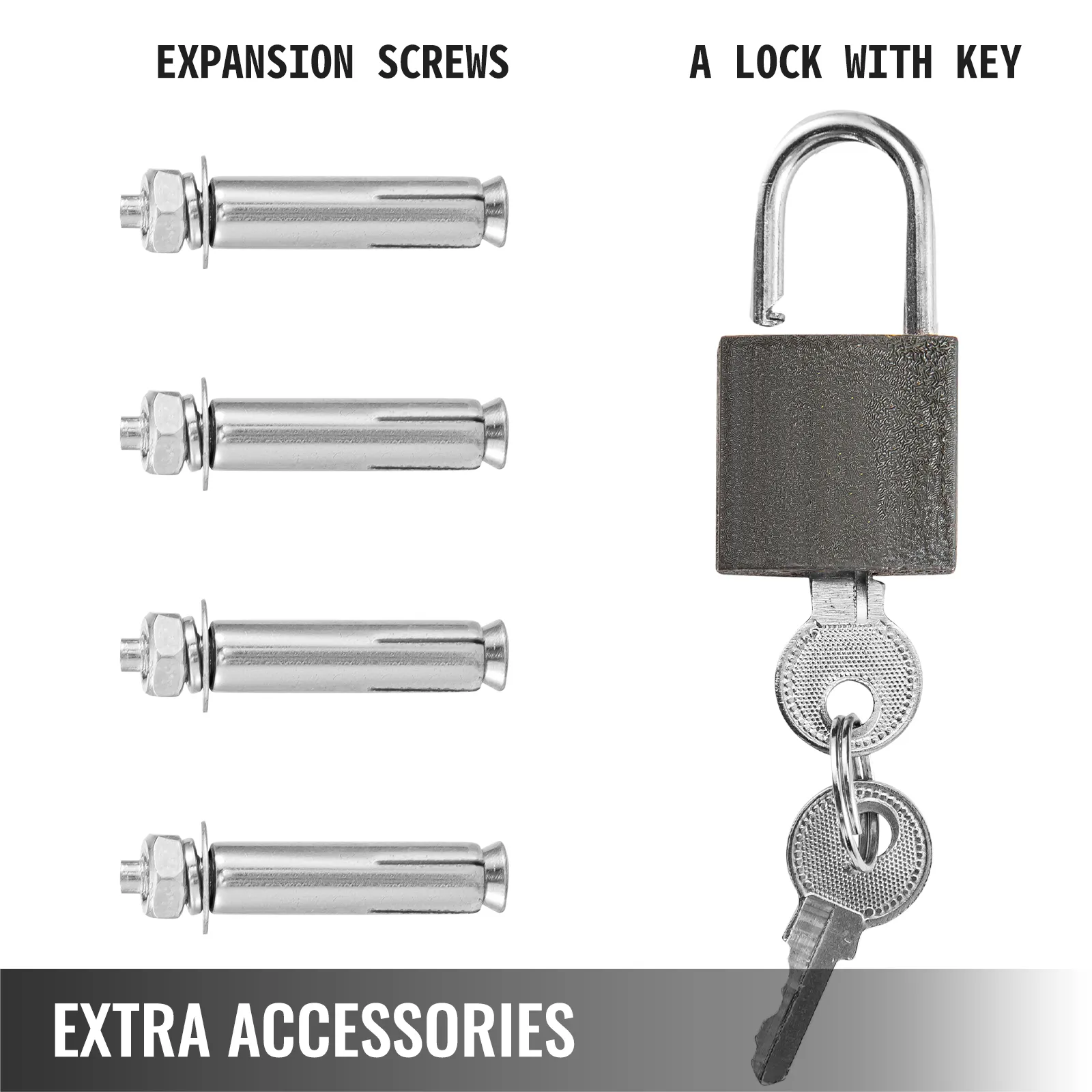 Wir haben vier Expansionsschrauben, einen Schlüssel und ein Schloss bereitgestellt, um den Käfig für Sicherheit und Stabilität zu verbessern.